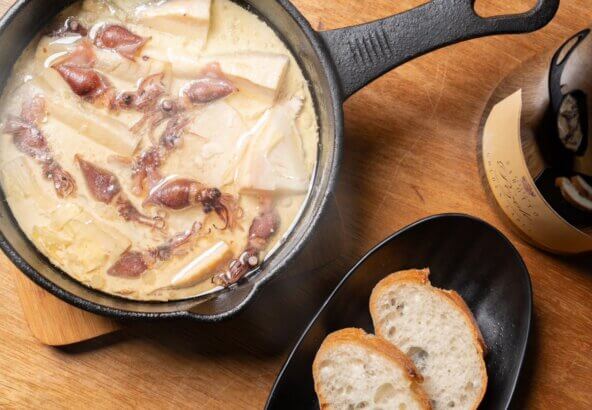 スルメイカとズッキーニのレッドアヒージョ