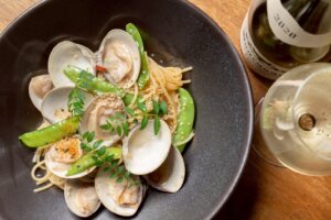 【蛤(ハマグリ)とサヤエンドウの木の芽香る和ペペロンチーノ】
